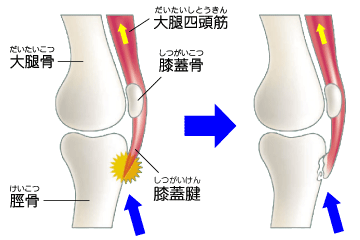 膝のお皿の下の骨(脛骨粗面)を強く引っ張ることで、