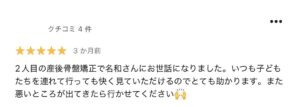 2人目の産後骨盤矯正で名和さんにお世話になりました。いつも子どもたちを連れて行っても快く見ていただけるのでとても助かります。また悪いところが出てきたら行かせてください🙌